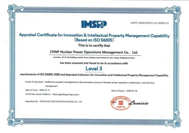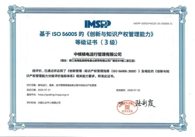 近日,秦山核电正式获得基于ISO56005的《创新与知识产权管理能力》3级证书。这是该国际标准正式推广以来中核集团认证的首张3级证书,也是秦山核电继2023年荣获国家知识产权优势企业后,在知识产权管理体系化建设上的重要突破。