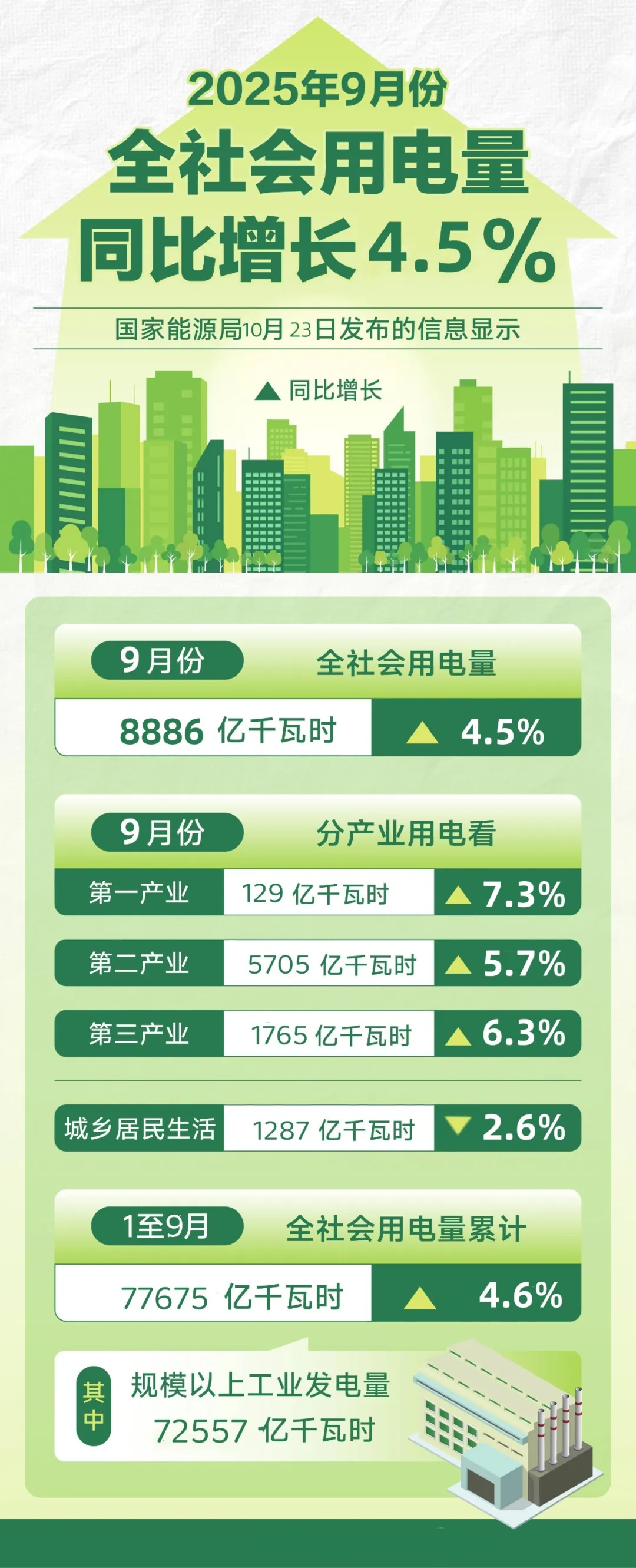 10月23日,国家能源局发布9月份全社会用电量等数据。