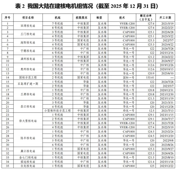 截至2025年底,我国在建核电机组35台,总装机容量4221.6万千瓦,高于在建核电机组数量排名世界第二位的印度和排名第三位的俄罗斯,连续第19年位居全球第一位(印度在建6台核电机组总装机容量为476.8万千瓦,俄罗斯在建核电机组5台,总装机容量分别为500万千瓦)。2025年,全国有9台核电机组实现核岛浇筑第一罐混凝土(FCD),总装机容量1103.3万千瓦,按照开工时间顺序依次是陆丰1号、石岛湾一期扩建2号、惠州3号、金七门1号、招远1号、三澳3号、宁德6号、陆丰2号、白龙1号等机组。