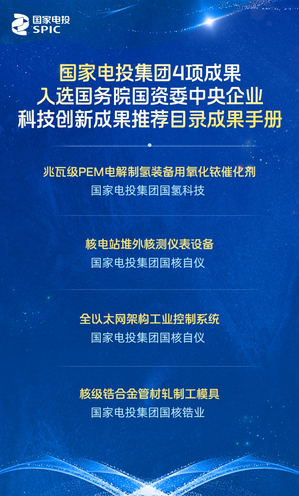 近日,国务院国资委发布《中央企业科技创新成果推荐目录成果手册(2024年版)》,国家电投集团4项成果入选。手册收录67家中央企业的263项成果,涵盖电子元器件、零部件、新材料、仪器仪表、软件产品、高端装备、制造工艺等7个领域,通过发布成果简介、主要指标、联系方式等信息,促进企业优秀创新成果推广应用和迭代升级,助力科技成果加速转化为现实生产力。