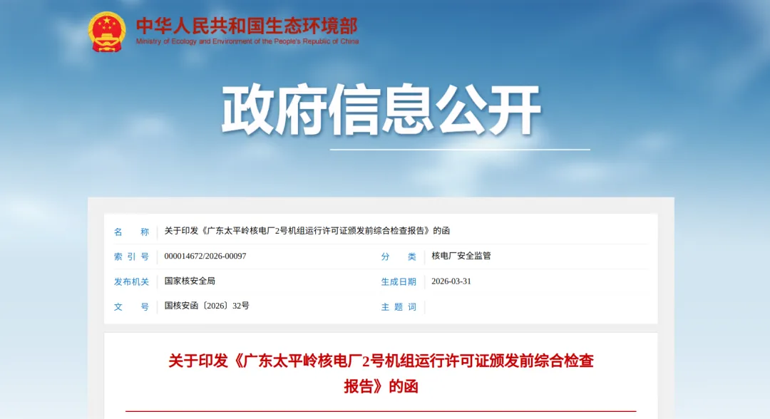 3月29日,国家核安全局发布关于印发《广东太平岭核电厂2号机组运行许可证颁发前综合检查报告》的函。